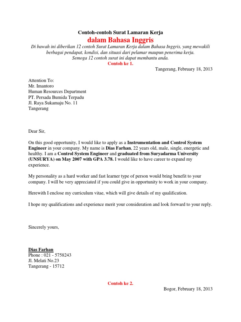 Pada prinsipnya, membuat surat lamaran pekerjaan dalam bahasa inggris sama halnya seperti ketika kita membuat surat lamaran pekerjaan dalam bahasa. Jika kamu mengirim surat lamaran kerja menggunakan surat secara langsung, atau dengan kata lain tidak melalui surel, sertakan informasi tentang dirimu di. Dalam banyak kasus format contoh surat lamaran kerja bahasa inggris ini memakai bahasa percakapan yang kurang formal. Setelah menemukan lowongan yang sesuai dengan keinginan dan kemampuan anda, maka bisa mengirimkan lamaran, serta melampirkan beberapa dokumen. Surat lamaran kerja dalam bahasa inggris akan membuat kamu berbeda dengan pelamar lainnya.