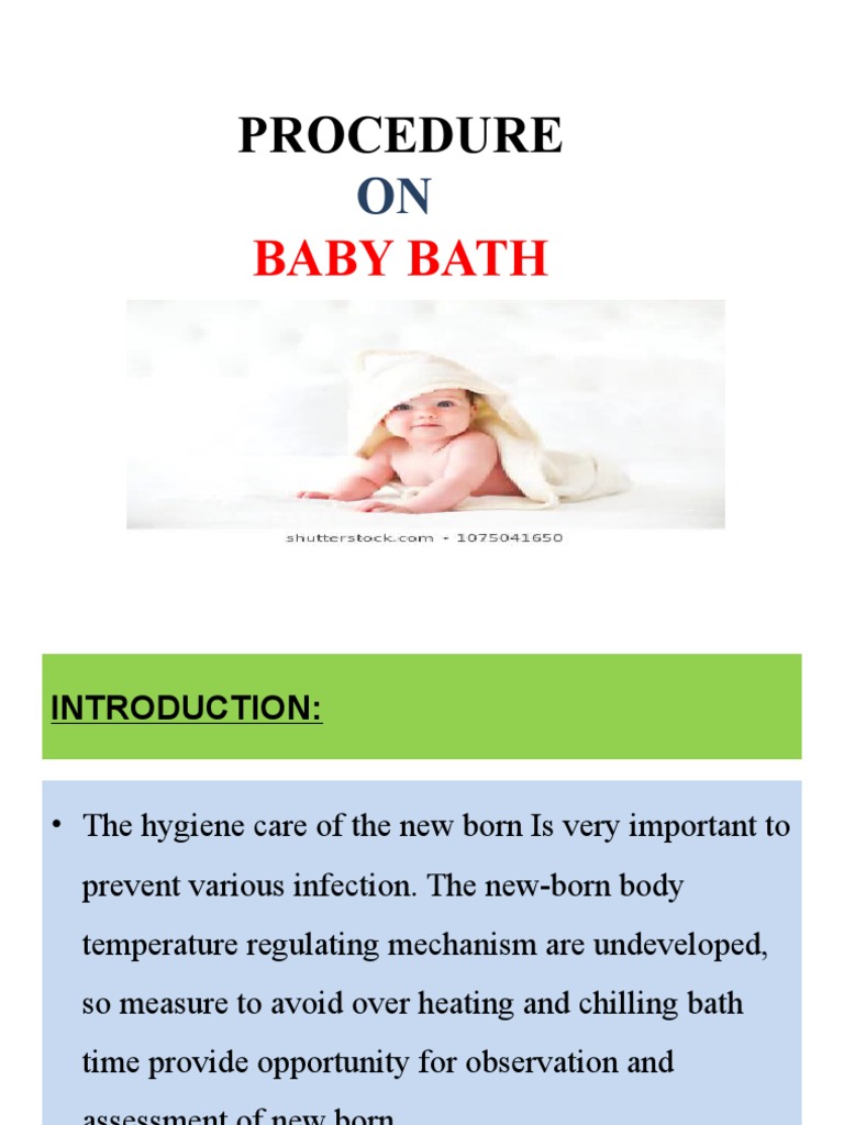 The newborn's body temperature regulating mechanisms are underdeveloped, so measures to avoid overheating and chilling. Fundamental of nursing procedure manual 12 careaction rationale 3)tuckthemackintoshunderthemattress. Our database contains more than 1 million pdf manuals from more than 10,000. Baby bath introduction child rearing practices during the first year vary from country to country. You may use your elbow, wrist or a special bath thermometer to make sure the water isn't too hot or cold for the baby. Baby bath procedure pdf / how to bathe a newborn baby step by step newborn baby / baby bath is defined as cleaning the skin of the baby for promoting hygiene and comfort in the home setting. The amount of bathing that is done is also inconsistent across cultures.unless contra indicated most infants and children can be bathed in a basin at the bedside or on the bed,or in a standard bath tub located on the unit which is often conveniently adapted for pediatric use. The cord usually falls off in 10 to 14 days. Until this happens, give your baby a sponge bath. Fill the tub with a few inches of warm water. Giving a bed bath means washing someone who is in bed. Unplug all electric items, such as hair dryers and radios. The first few months of your baby's life are an amazing time.